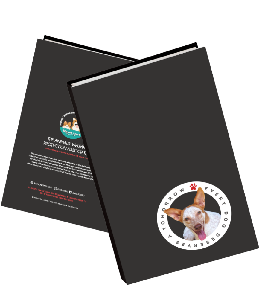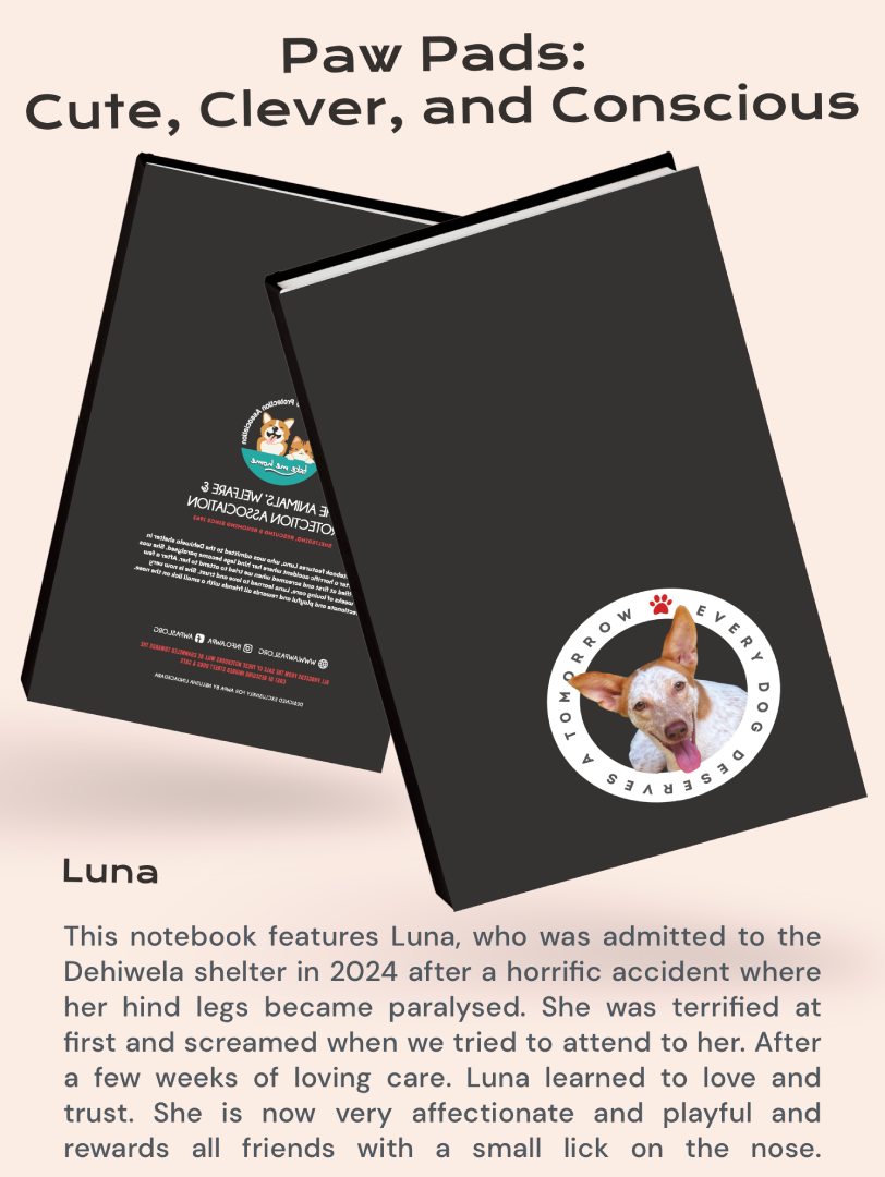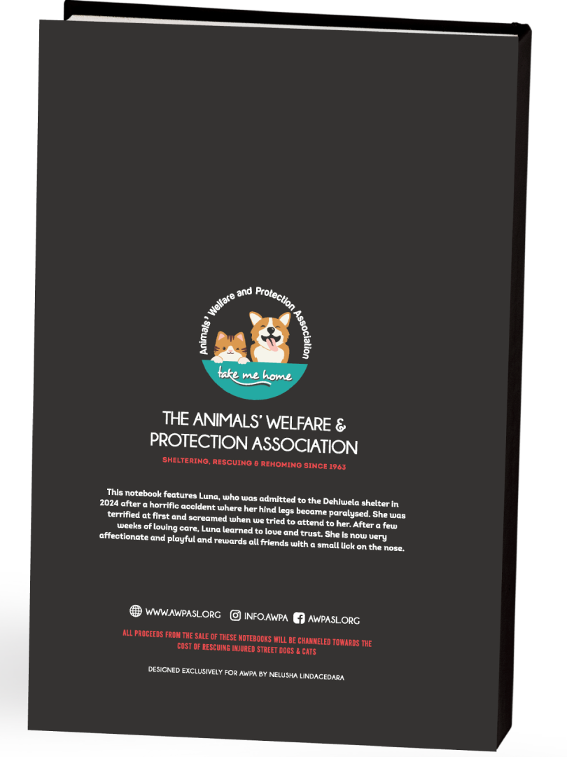 This notebook features Luna, who was admitted to the Dehiwela shelter in 2024 after a horrific accident where her hind legs became paralysed. She was terrified at first and screamed when we tried to attend to her. After a few weeks of loving care. Luna learned to love and trust. She is now very affectionate and playful and rewards all friends with a small lick on the nose.
