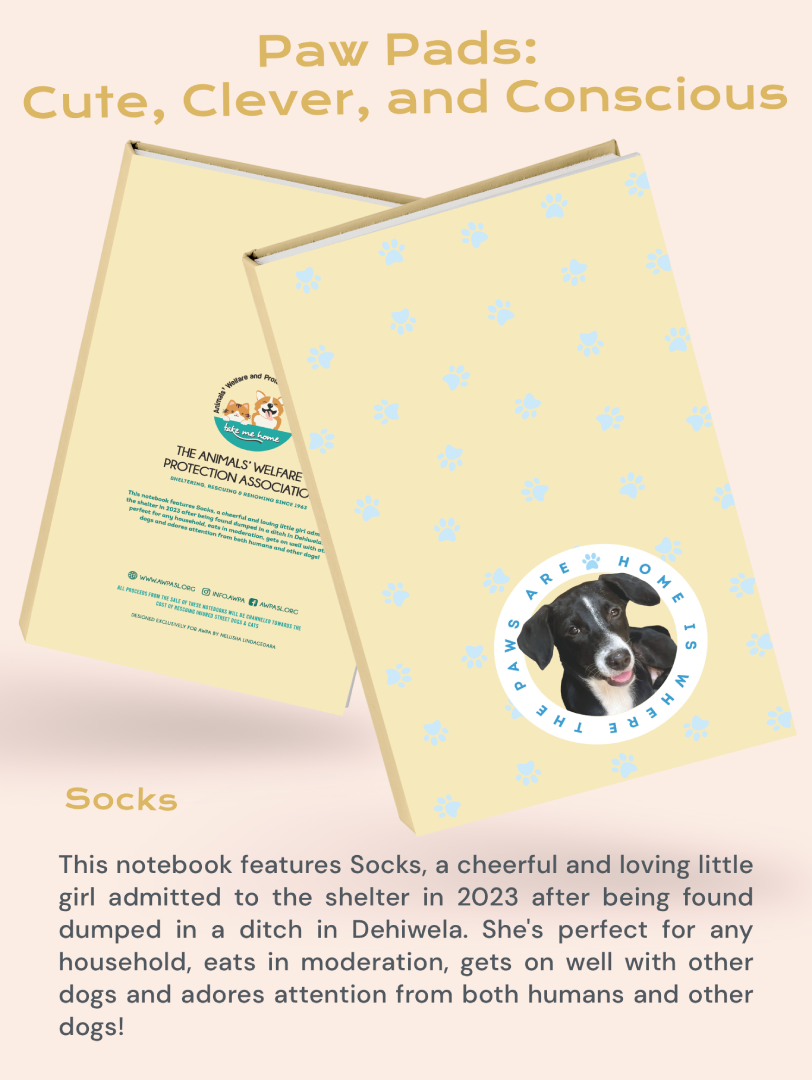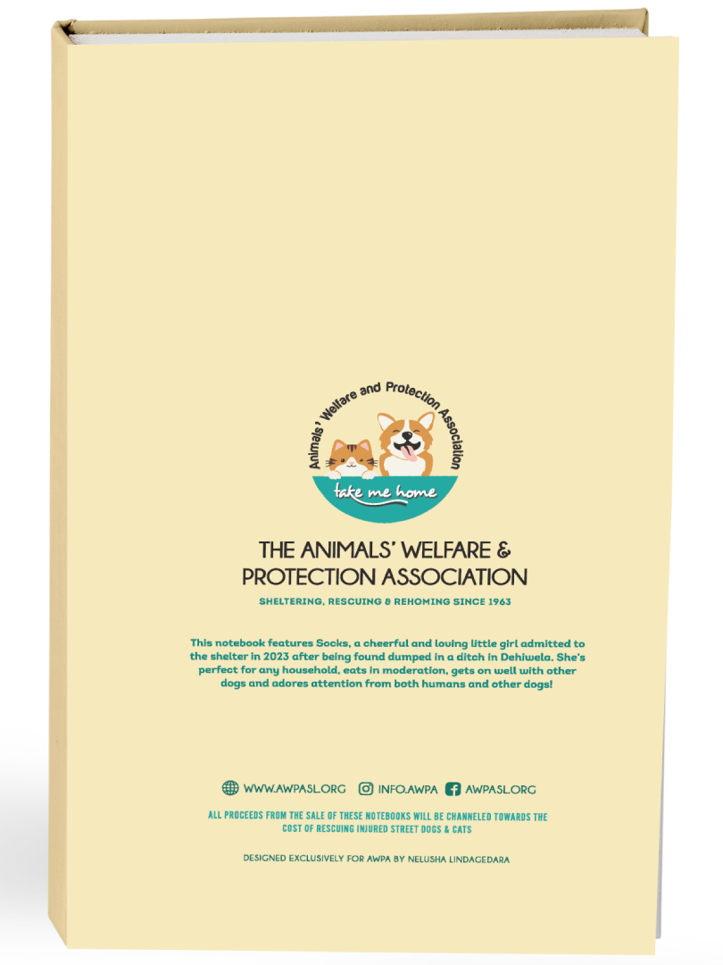 This notebook features Socks, a cheerful and loving little girl admitted to the shelter in 2023 after being found dumped in a ditch in Dehiwela. She’s perfect for any household, eats in moderation, gets on well with other dogs and adores attention from both humans and other dogs!